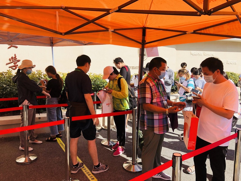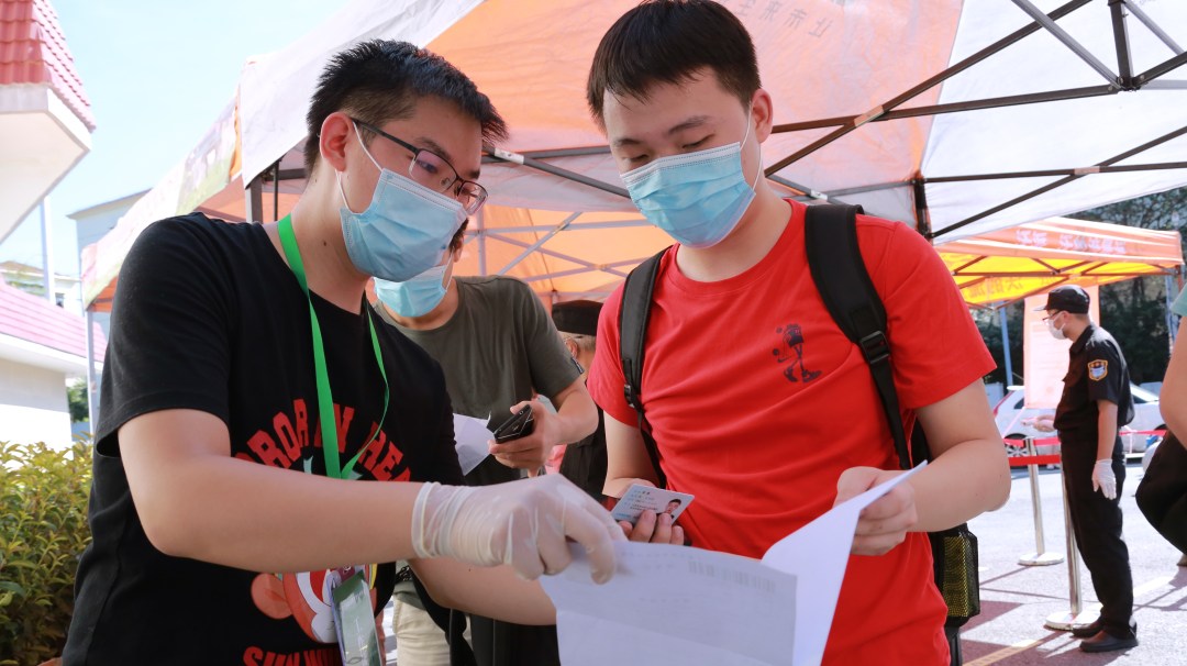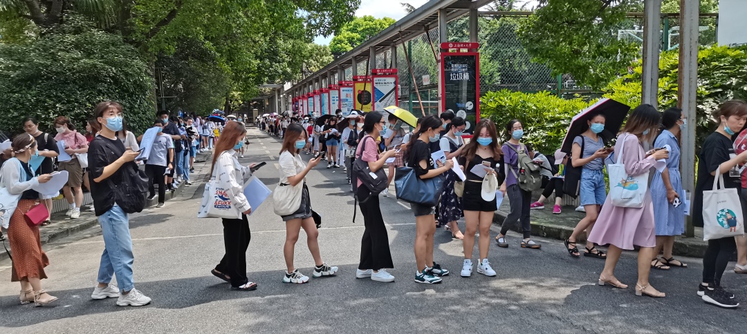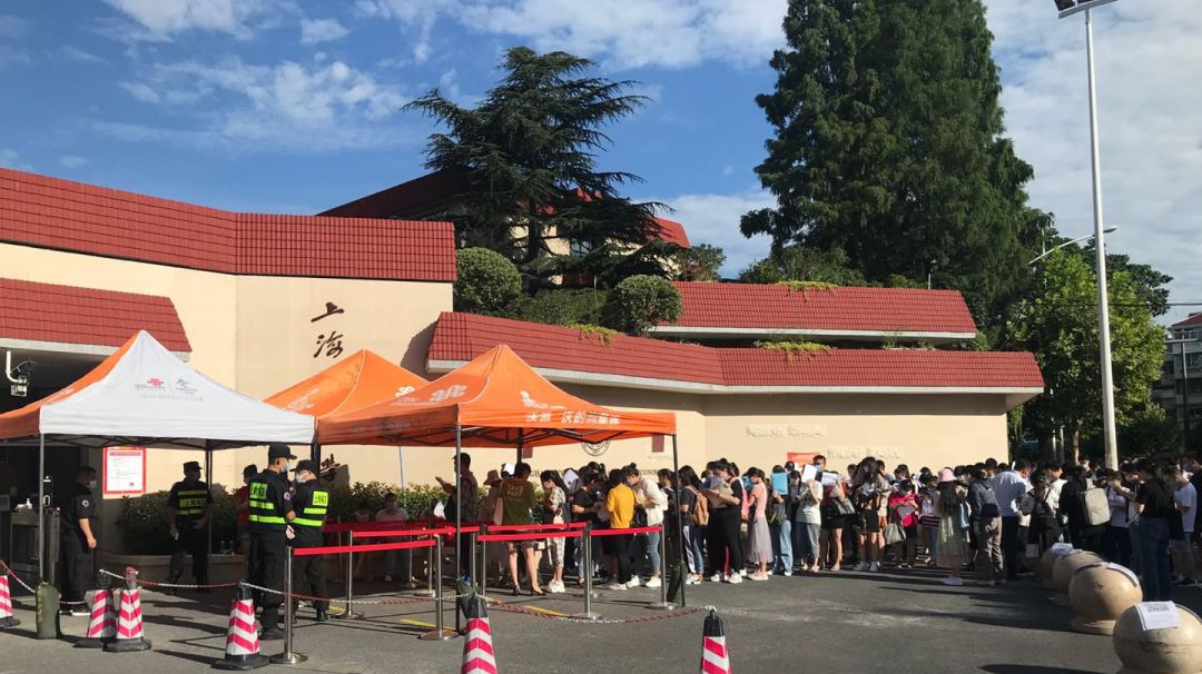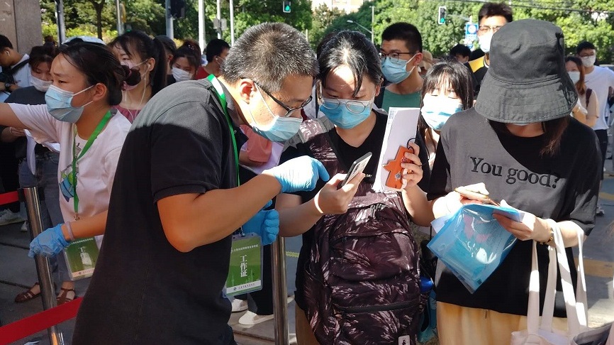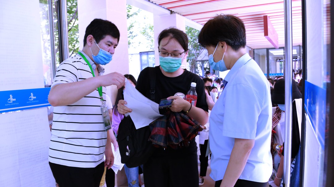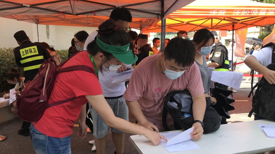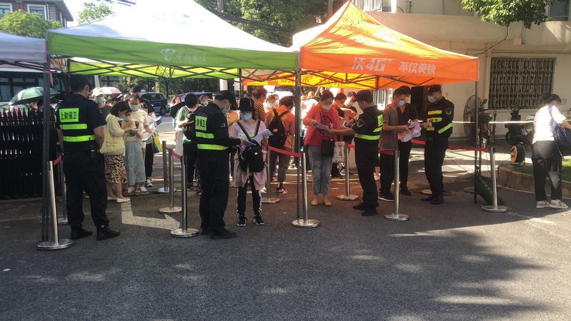 本次考试防疫要求很高,每位考生需要检查5份证明材料。因此,校区入口的工作人员压力很大,顶着烈日和高温,既不能错放考生进入,又要兼顾入场速度。每位老师汗流浃背依然一丝不苟,对不符合规定无法进校考生耐心解释沟通。遇到特殊情况,驻点医生及时指导处理,确保入场环节顺利。