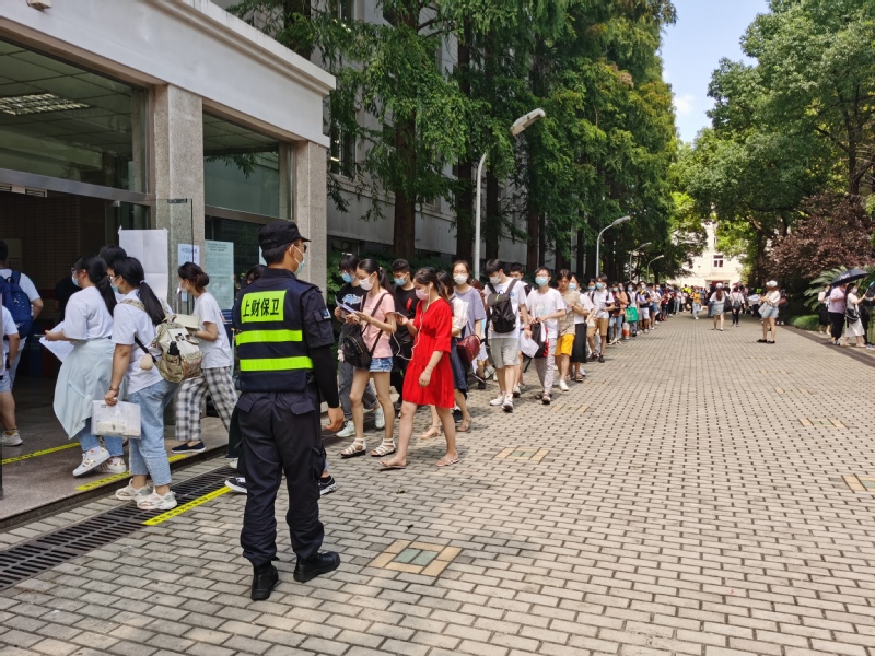 为防止考生出现中暑等意外情况,确保考生身体健康和生命安全,学院采取了一系列措施。考前考生的5 份证明材料检查分校区入口与教学楼入口两段进行;考生进入校区无法进考场前,在教学楼外的指定阴凉区休息等待;考中加强巡查,在上海理工大学考点发现一名考生突发头晕,驻点医生及时处理,等学生身体恢复后让其继续考试。每场考试结束后,严格按照防疫要求做好场地清洁消毒。
