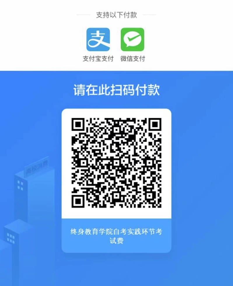 考生报完实践课程后,请于9月9日-9月10日(仅此2天)通过支付宝或微信扫描如下二维码完成费用支付。支付成功后,才算报名成功。考生因个人原因未能参加考试的,报名费不予退还。